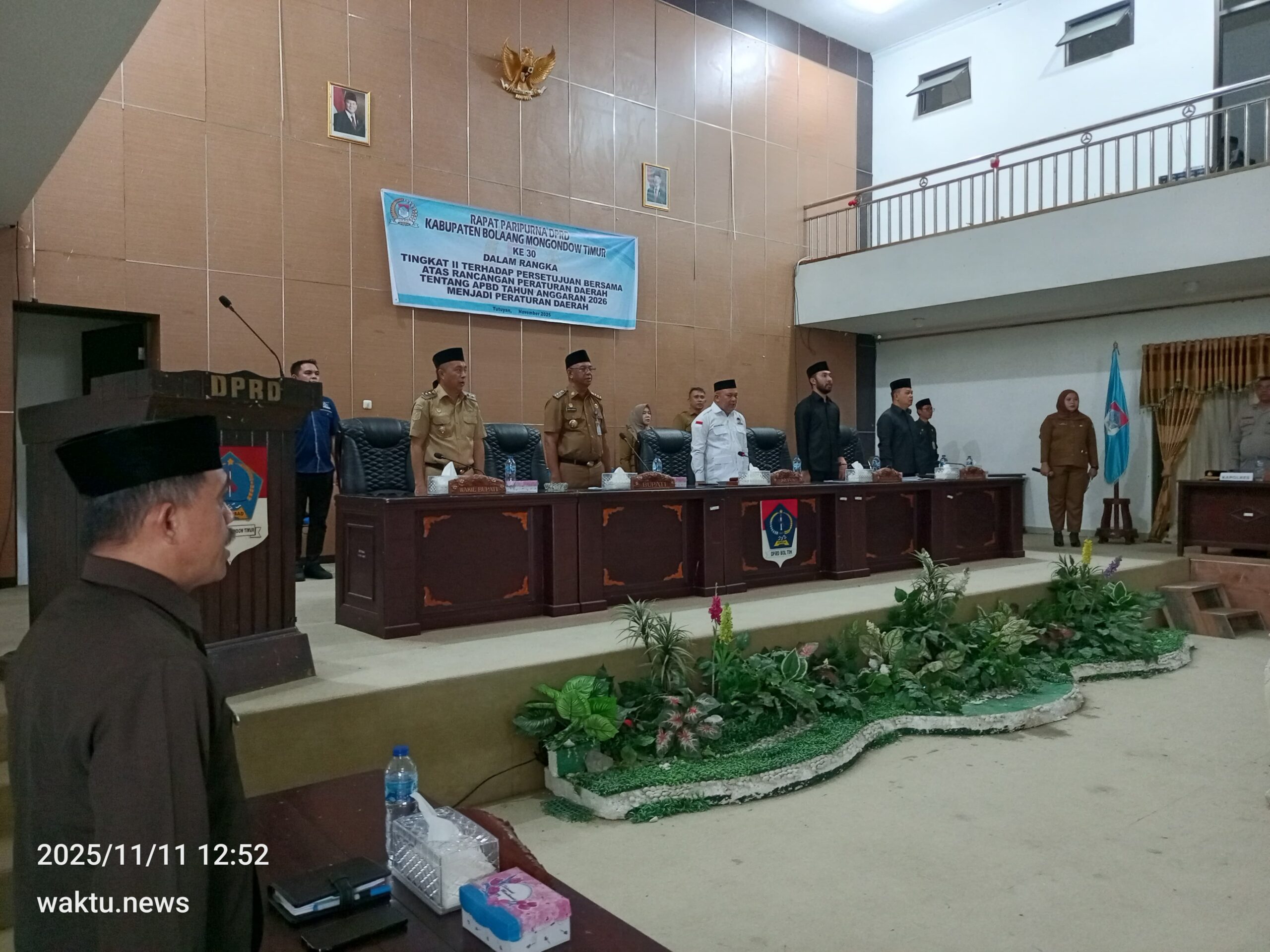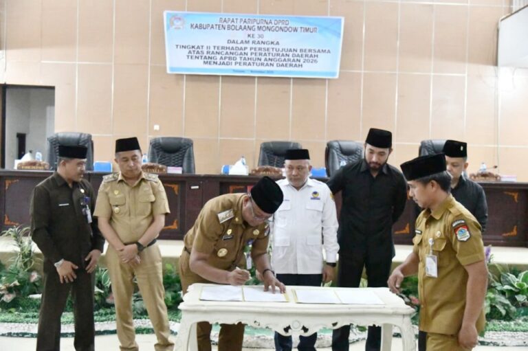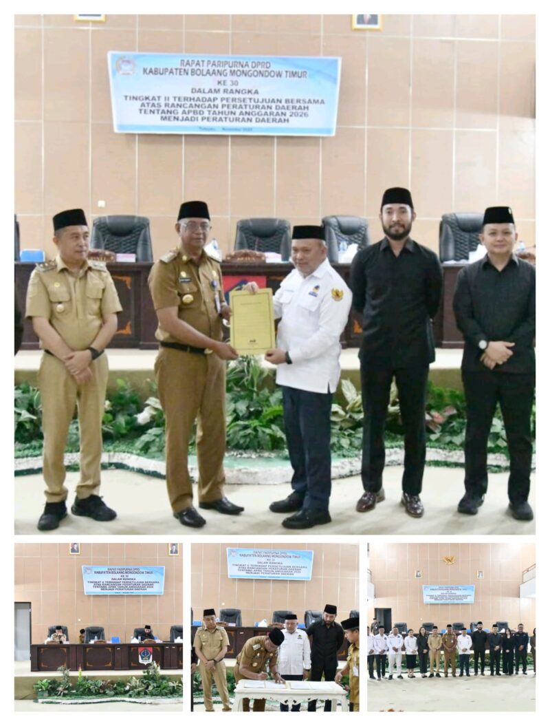 BmrNews.com BOLTIM – Dalam rangka Rapat Paripurna Tingkat II yang digelar oleh Dewan Perwakilan Rakyat Daerah (DPRD) Kabupaten Bolaang Mingondow Timur (Boltim), Persetujuan Bersama atas Rancangan Peraturan Daerah tentang Anggaran Pendapatan dan Belanja Daerah (APBD) Tahun Anggaran 2026 menjadi Peraturan Daerah berlangaung khidmat.
